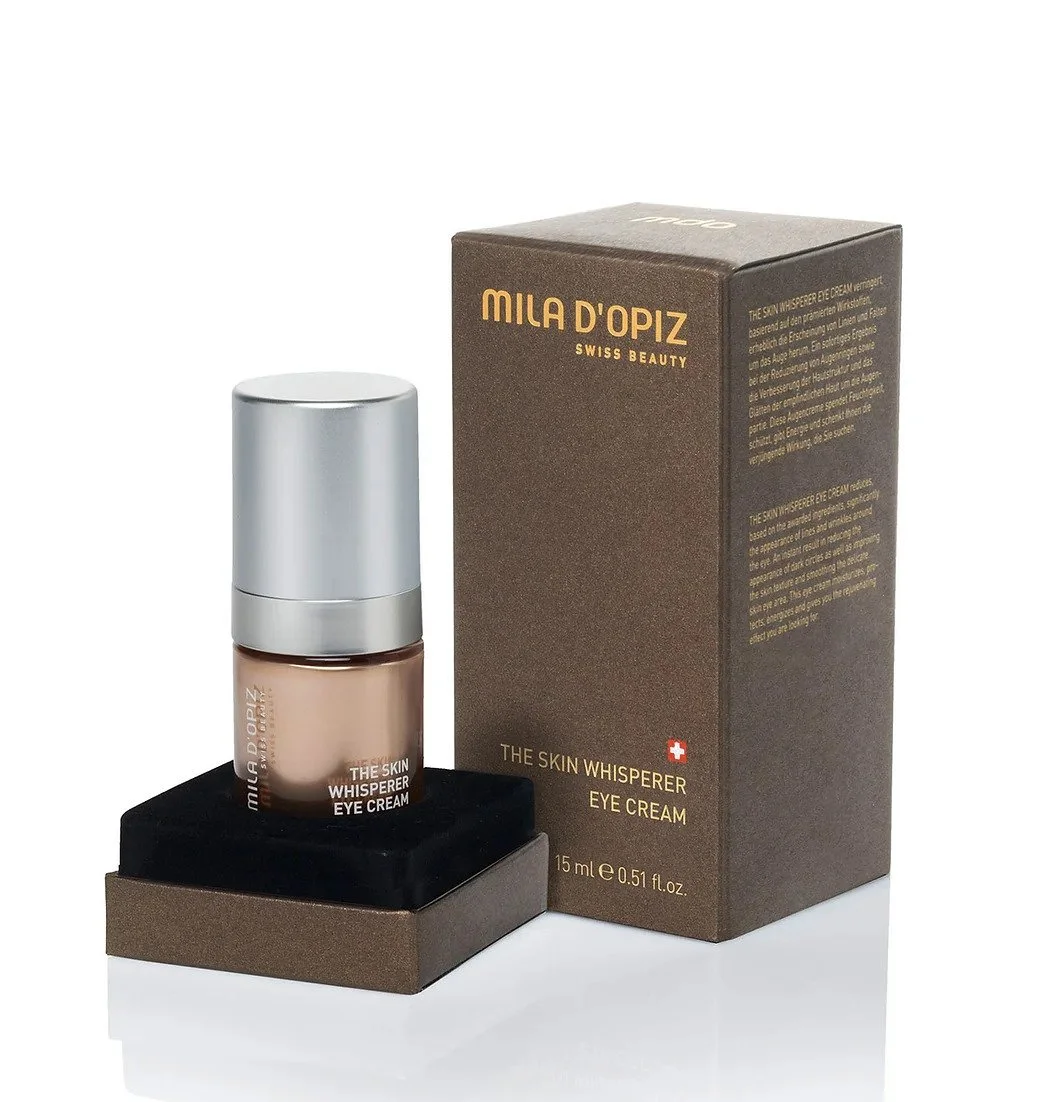 The Legend goes on…It all started with the search for the Holy Grail, the search for „eternal youth“. The result has been the development of the Skin Whisperer Cream which has been awarded as most innovative and best cream in 2014/15.We followed by introducing the Skin Whisperer Serum and are now proudly adding the Skin Whisperer Eye Cream to the family. The eye cream is based on the fabulous ingredients of the cream which determine the effective results and has in additon the utmost recent active ingredients and oils combined to receive even a more intensive outcome. The innovative high-performance eye cream regenerates, rejuvenates, hydrates, soothes from the deep layers of the skin. Mila d‘Opiz has succeeded to combine high-tech anti-aging formula with the greatest legendary beauty dream of mankind. Nowadays consumers expectations for eye care products are usually: Reduction of puffiness, reduction of dark circles, reduction of wrinkles and fines lines, illuminating, fast results, less tired – more energetic, overall antiageing effect. The Skin Whisperer Eye Cream does satisfy those expectations and works significantly in only 7 days..